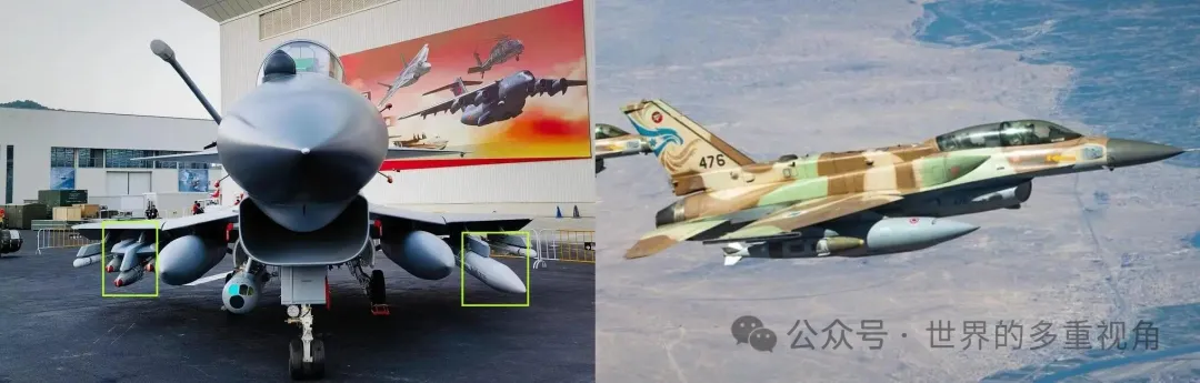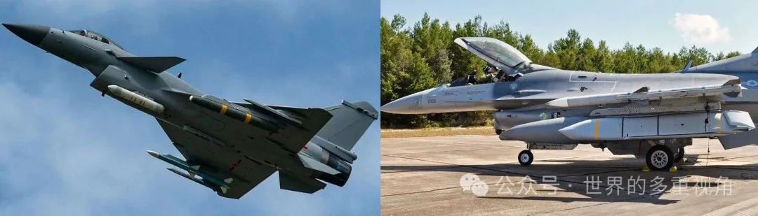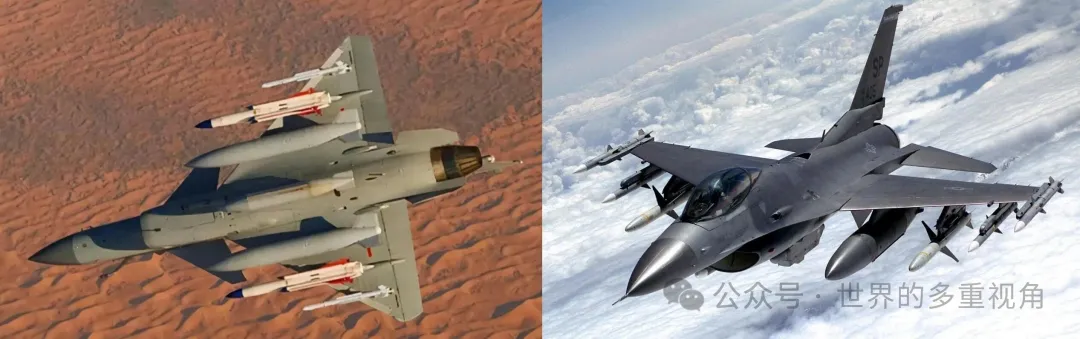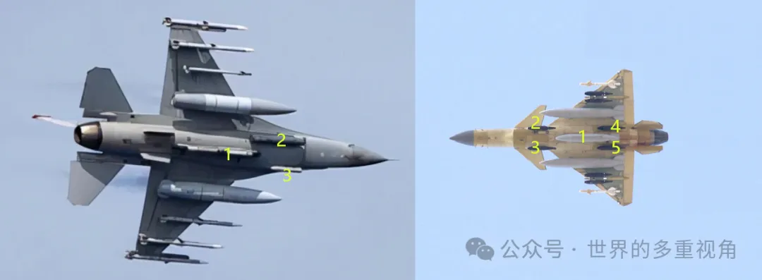 F-16机腹有3个挂点,只能带副油箱或者吊舱,不能带武器。歼-10机腹有5个,其中4个可以带武器。