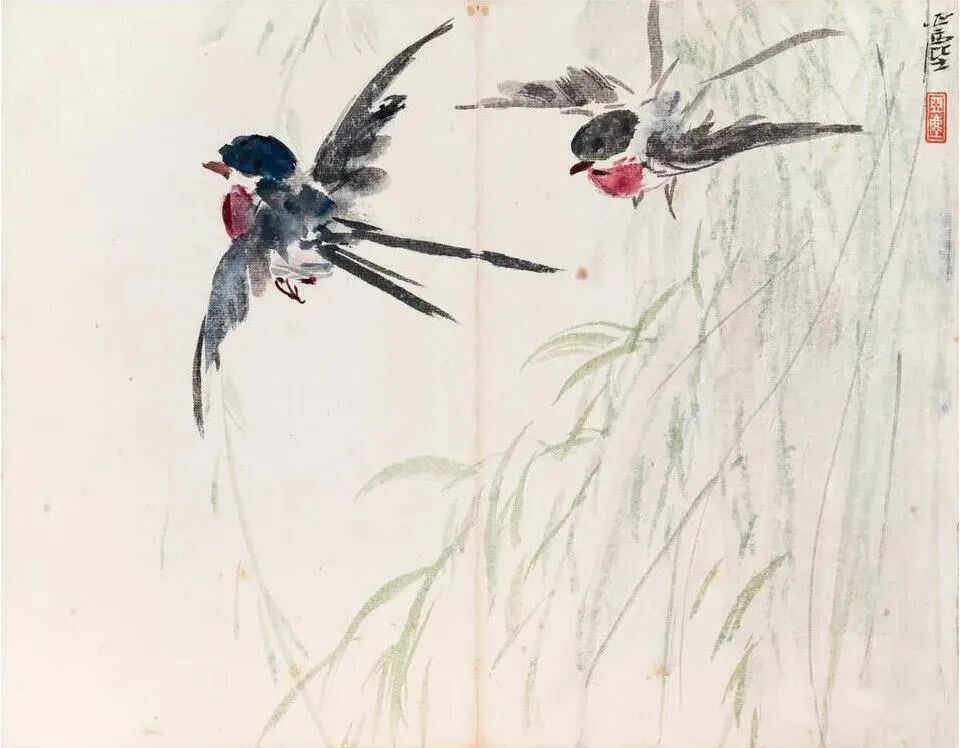 用墨汪亚尘属于当时艺术流派中的“激进分子”,他的动物作品以细致的小写意作品居多,用墨有着水彩的画风。这正是他有别于其他画家艺术风格的新探索。此类画真正成熟的精品画作是在晚年,这时期的花鸟作品用墨用色有燥有润,有浓有淡,变化多端,极富表现力和美感。