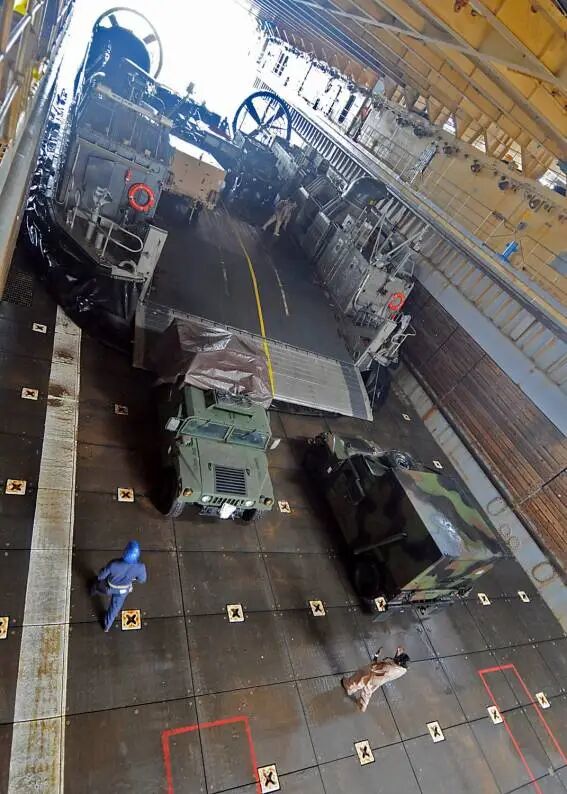坞井甲板能够容纳4艘气垫登陆艇,或21艘LCM-6机械化登陆艇,或最多36辆两栖突击车。航空设施方面,该舰配备长64.6米,宽25.3米的飞行甲板,设有2个直升机起降点,但未设置机库。舰艇人员编制为350人,可搭载海军陆战队分遣队402人,另具备增容102人的能力。武备包括两座后期加装的Mk-49发射器用于发射RIM-116“拉姆”防空导弹、两座Mk-15“密集阵”近防武器系统、两套Mk-38机枪系统以及六挺12.7毫米口径M2机枪。