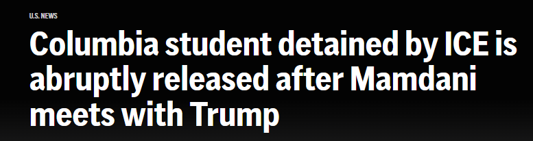 当时,正在华盛顿访问的纽约市长佐赫兰·马姆达尼在与特朗普总统的闭门会晤中,直接表达了对阿加耶娃被捕一事的担忧。马姆达尼透露,特朗普已向他做出承诺,称阿加耶娃很快就会被释放。果然,在马姆达尼发帖几分钟后,阿加耶娃也在Instagram上发帖证实自己已获释。