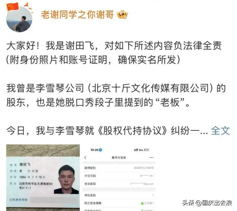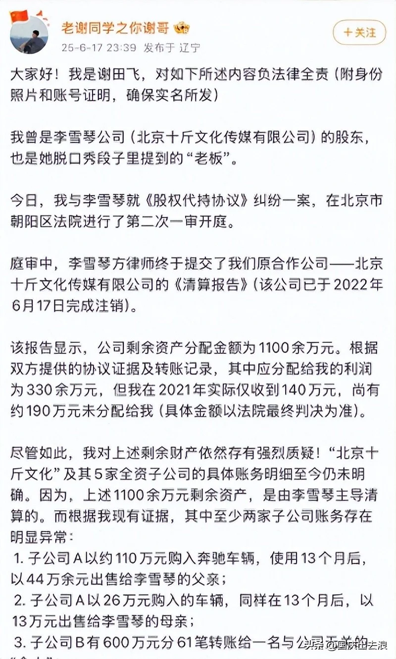 022025年6月17日,知名脱口秀演员、艺人李雪琴,被昔日合伙人谢田飞公开实名举报。