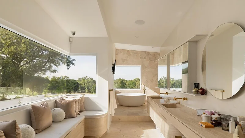 位于 3/249 Harts Road, Indooroopilly 的主卧套房浴室,设有化妆区、休息室、巨大的步入式淋浴间以及可欣赏高尔夫球场美景的圆形独立浴缸。