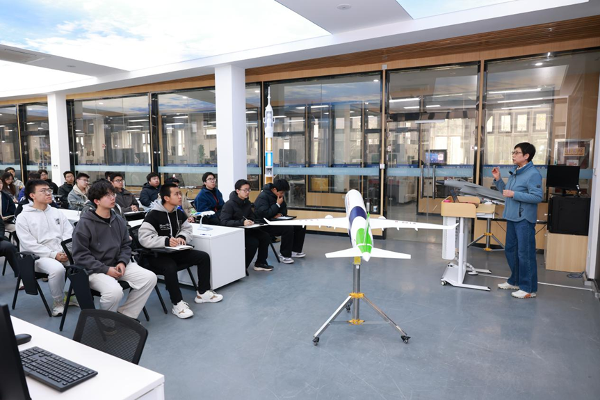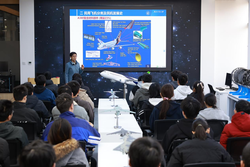 顶尖的师资团队是这门金课的核心支撑。学校统筹“三航”学科和人才优势,特邀航空、航天、航海、动力、控制、制造、材料七大领域的9名国家级教学名师及总师深度参与课程授课,组建起一支兼具理论高度与实践深度的教学团队。国家级教学名师、航空学院教授赵美英担任首位授课教师。赵美英围绕军机、民机等飞行器的结构设计原理、核心技术特点与应用场景展开系统讲解,凭借扎实的学术积淀和鲜活的工程案例,带领学生走进飞机设计与制造的殿堂。