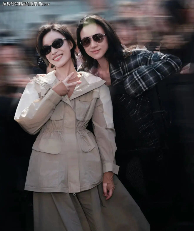 两人同样佩戴墨镜晒合照,一个穿短风衣帅气时尚,一个穿格纹外套知性大方!