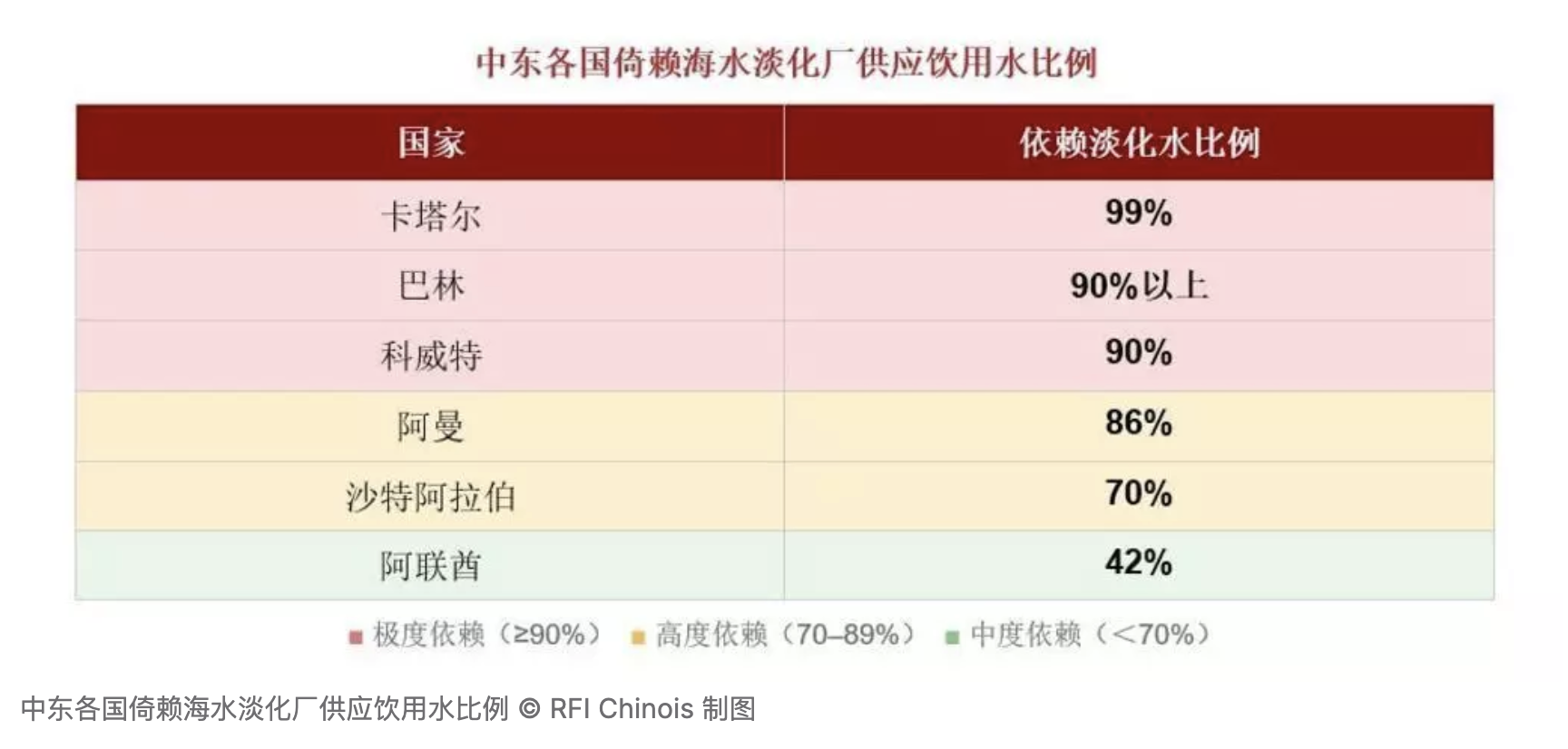 海湾各国对淡化水的依赖程度触目惊心:卡塔尔99%的饮用水来自淡化设施,巴林超过90%,科威特和阿曼分别为90%和86%,沙特为70%,阿联酋亦达42%。