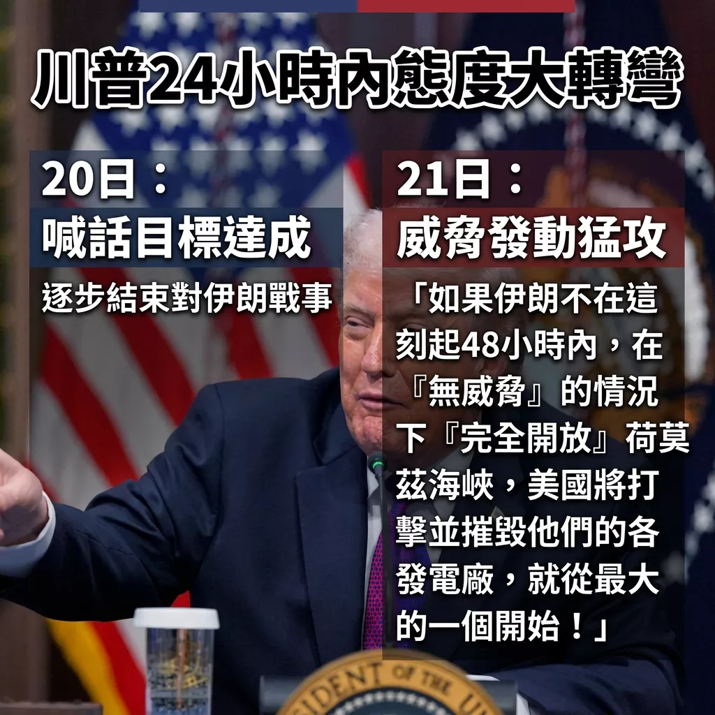 川普针对中东局势发表严厉警告,明确设定48小时最后期限。他说,「如果伊朗不在这刻起48小时内,在『无威胁』的情况下『完全开放』荷莫兹海峡,美国将打击并摧毁他们的各个发电厂,就从最大的一个开始!」