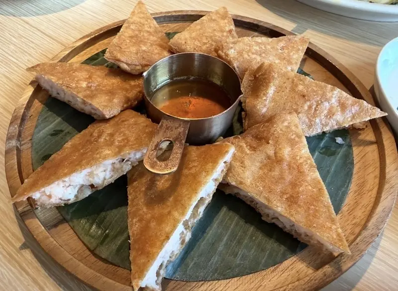 瓦城招牌「月亮虾饼」风味与台湾差异不大,整体表现稳定。(记者谢雨珊/摄影)