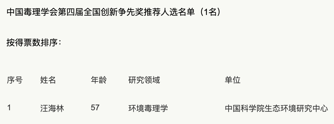 汪海林被推荐为创新争先奖候选人中国毒理学会