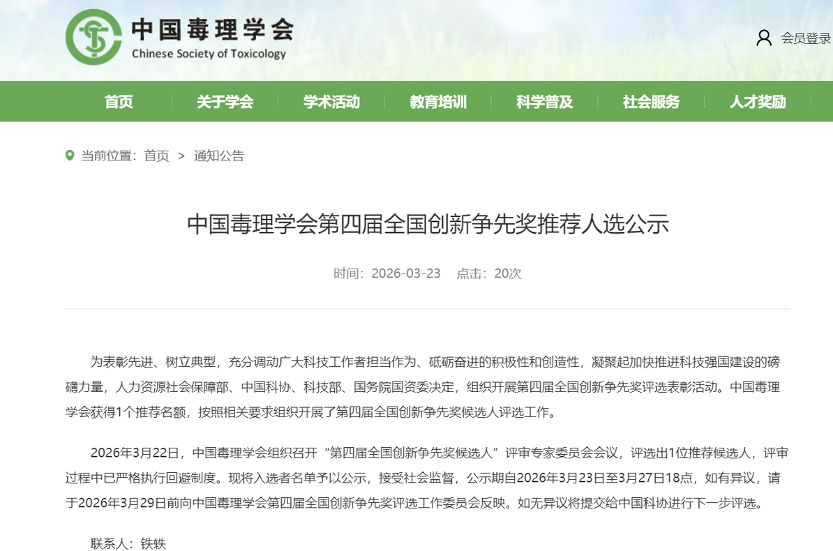 2026年3月22日,中国毒理学会组织召开“第四届全国创新争先奖候选人”评审专家委员会会议,评选出1位推荐候选人,评审过程中已严格执行回避制度。现将入选者名单予以公示,接受社会监督,公示期自2026年3月23日至3月27日18点,如有异议,请于2026年3月29日前向中国毒理学会第四届全国创新争先奖评选工作委员会反映。如无异议将提交给中国科协进行下一步评选。