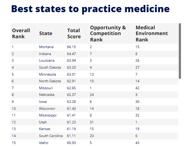 WalletHub的一项最新分析,通过比较全美50个州和华盛顿哥伦比亚特区的19项指标(包括薪酬、医院可及性和医疗体系质量),对各州对医生的友好程度进行了排名。