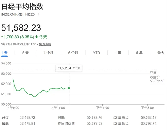 日经225指数开盘下跌1.68%,盘中一度下跌逾2600点,截至发稿,跌幅为3.35%,报51582.23点。
