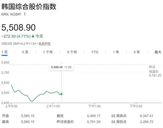 韩国KOSPI指数开盘下跌3.5%,跌幅一度扩大至逾6%,截至发稿,下跌4.71%,报5457.13点。
