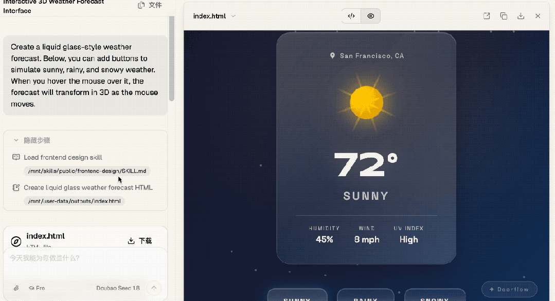一句话生成液态玻璃天气界面,鼠标悬停还能3D形变。