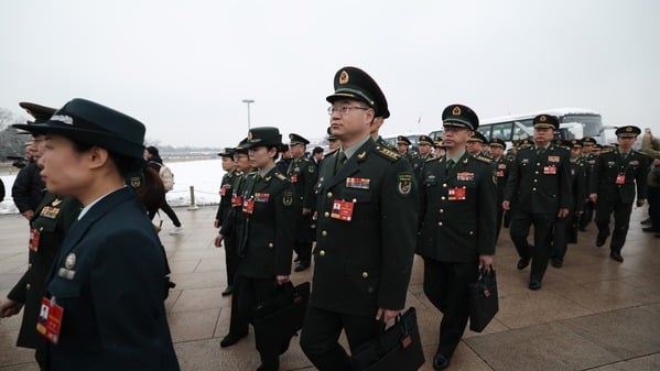 2026年3月5日,中共全国人大第四次会议在北京人民大会堂开幕,中共军委代表团抵达会场。(图片来源:Getty Images)