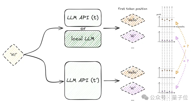 为了克服这种随机噪声,该技术通过向API发送简短提示词并获取单Token输出,重复采样N次以建立统计基准。