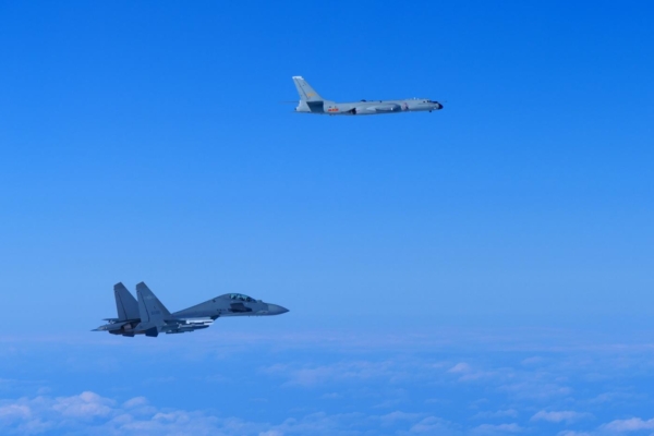 图为2024年11月29日,中共轰-6轰炸机前往日本海,未见挂载武器;护航的歼-16一侧机翼挂载2枚空对空导弹,两侧总计应外挂4枚空对空导弹。11月30日,歼-16 也同样挂载4枚空对空导弹。(日本防卫省)