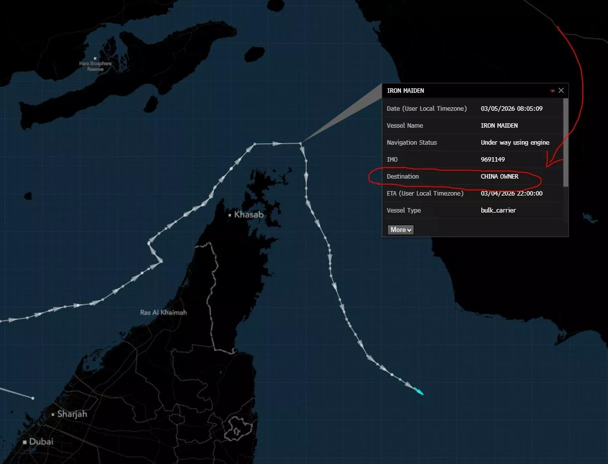 2026年3月5日,图为一艘名为铁娘子号的货船将船舶识别信号改为“中国船东”后,安全通过遭伊朗关闭的霍尔木兹海峡。(截图自X@SStapczynski)