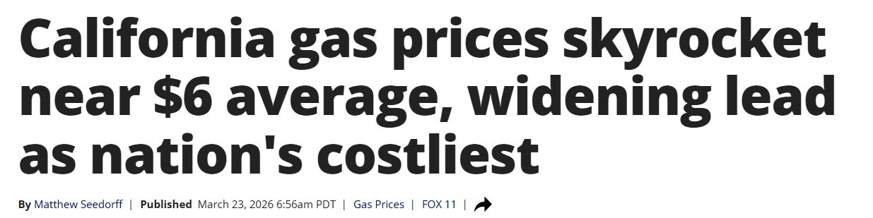 截至3月22日周日,全美平均油价约为每加仑3.94美元,而加州全州平均价格已接近5.76美元。在洛杉矶,油价更高,平均约为每加仑5.87美元。