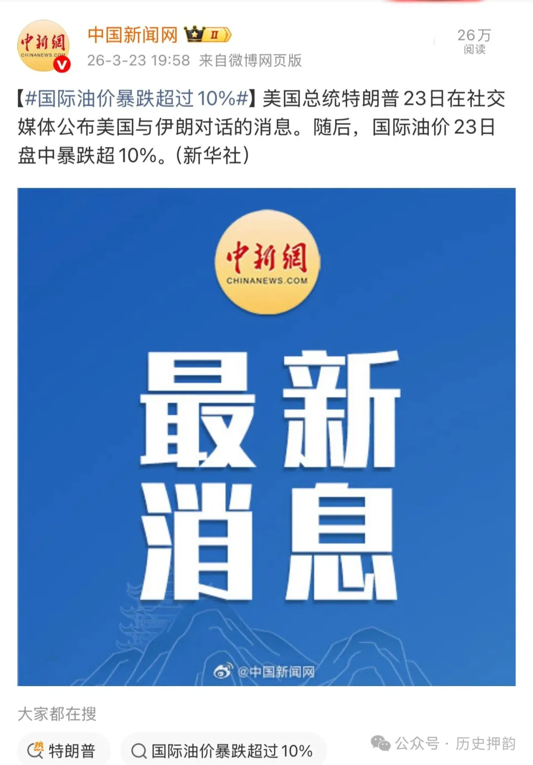 川普太坏了,他只是在社交媒体单方面宣称美伊就“中东敌对行动解决方案”进行了“富有成效的对话”,并推迟原定对伊朗能源设施的军事打击计划。这一表态被市场解读为地缘冲突缓和的信号,直接触发原油抛售潮。