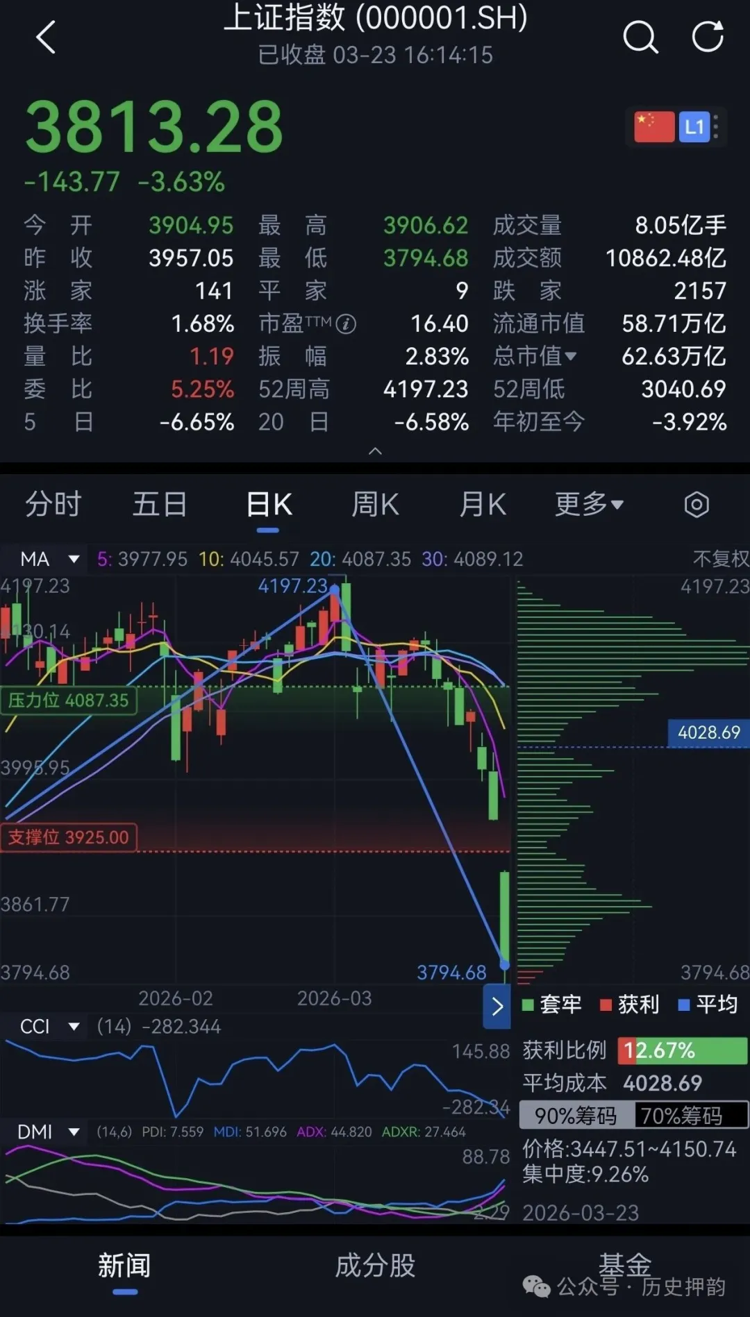 而A股市场今天也暴跌了,上证指数跌了3.63%。