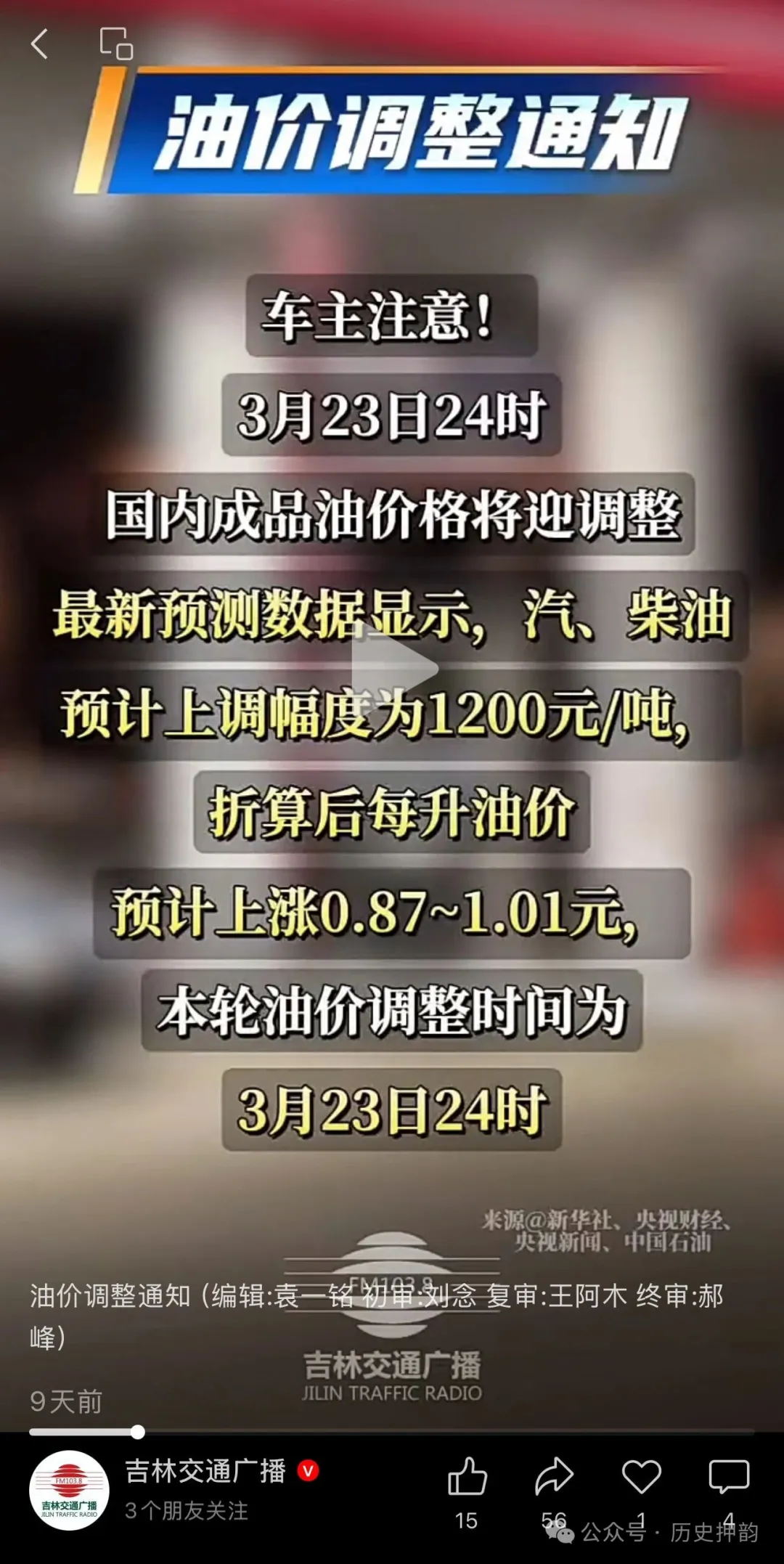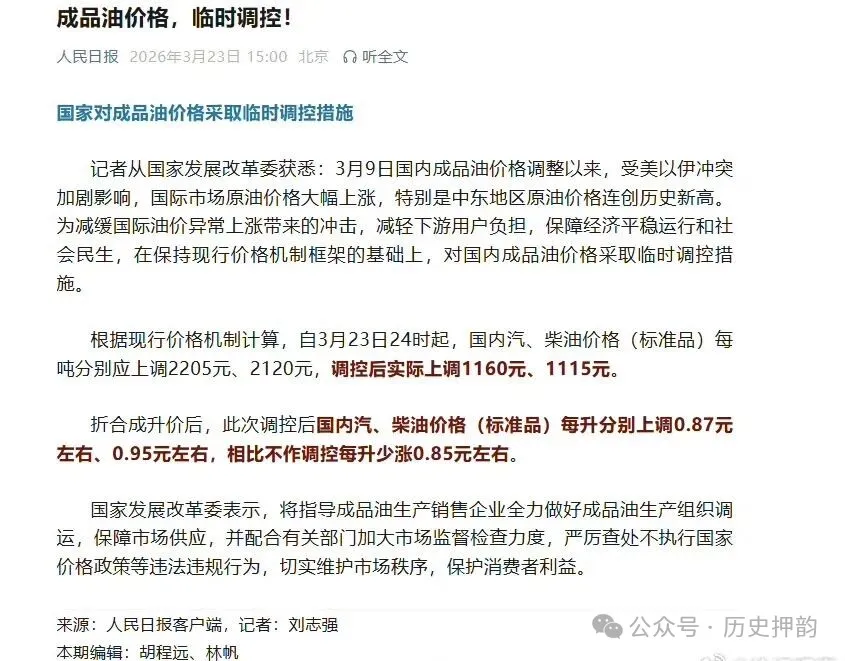 在上一次油价上涨之后我就写了一篇文章,其中引用了媒体的报道,当时的报道就写得很清楚,3月23日24时,汽柴油涨价0.87~1.01元。