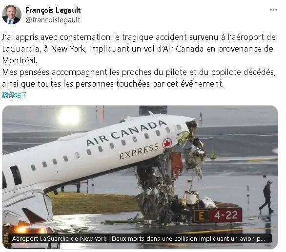 他在X平台上写道:“昨晚在纽约发生的加拿大航空快运航班事故,造成机长和副机长遇难,多人受伤,令人深感悲痛。”