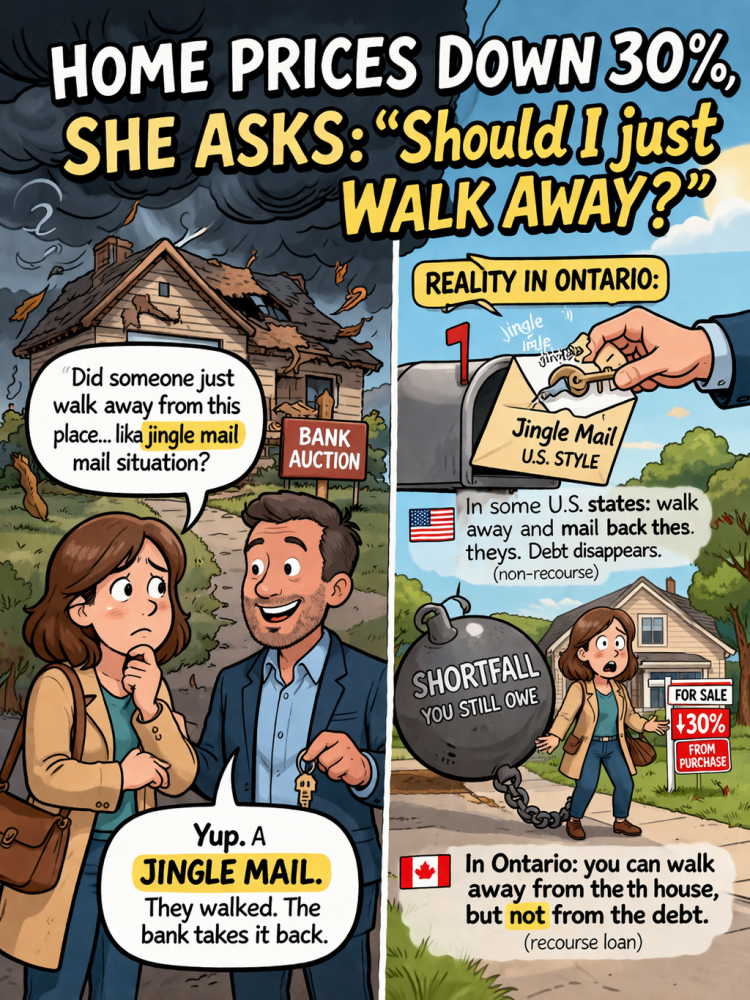 但在安省,情况完全不同。这里大多数房贷属于 recourse loan(有追索权)。也就是说,即使你放弃了房子:银行仍然会按市场价出售,如果卖得多,多余部分要退还给业主,如果卖得少,差额部分,仍然由业主承担。也就是说:房子可以不要,但债务不会一起消失。