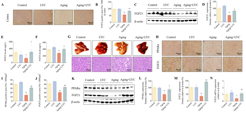 核心发现:番茄红素激活肝脏-大脑FGF21信号。 研究发现,番茄红素显著提高了衰老小鼠大脑和血浆中的FGF21水平(长寿激素),它改善了衰老导致的肝脏损伤,并提高了肝脏中关键蛋白PPARα和FGF21的表达 。