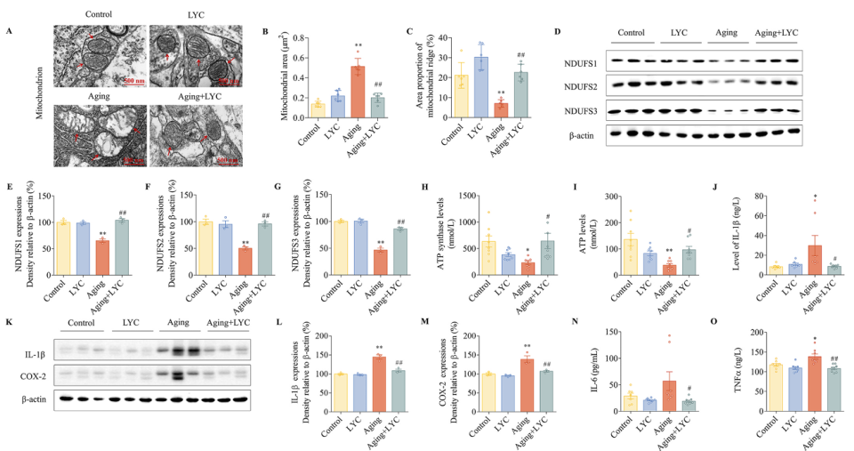 番茄红素确实能改善衰老导致的记忆力下降。 在空间工作记忆测试(Y迷宫实验)中,衰老小鼠的表现显著下降,而补充番茄红素后,它们的记忆能力得到了显著改善。同时,番茄红素还减少了大脑衰老相关的标记物,比如脂褐素和SA-β-gal的积累,并降低了衰老蛋白P21和P53的表达 ,这都表明它对大脑衰老有积极的保护作用。