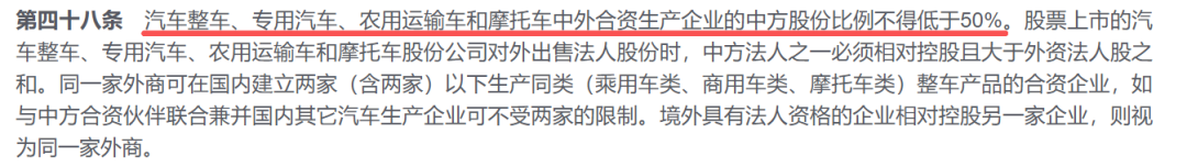 过去中国对合资的要求,是来自 1994 年的《汽车工业产业政策》:生产汽车整车产品的合资项目,中方所占股份比例不得低于 50% 。