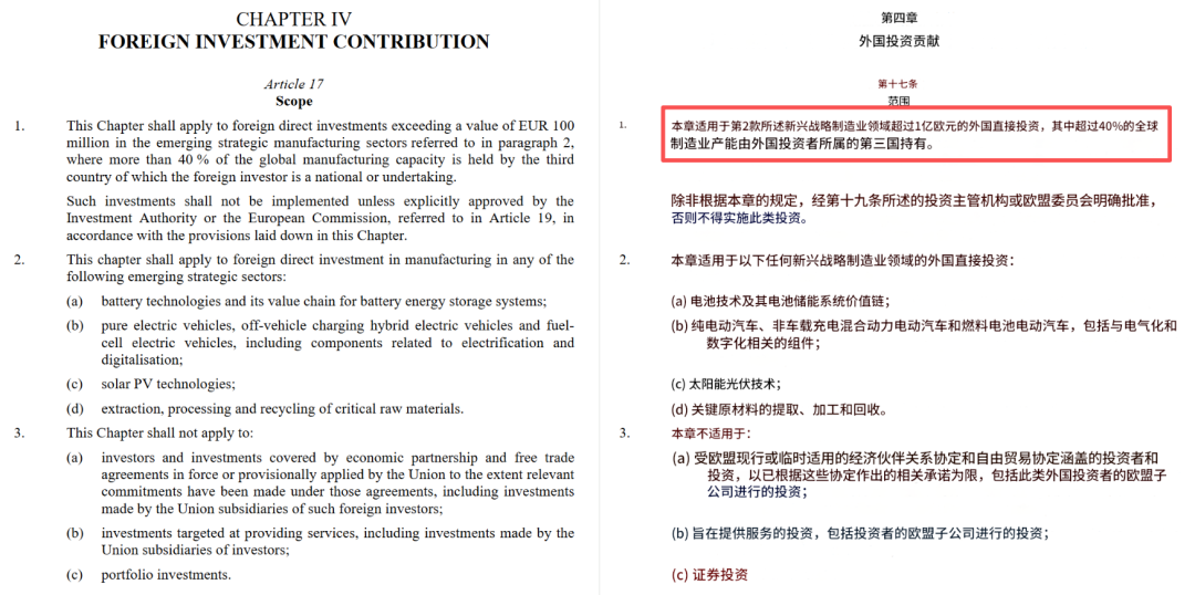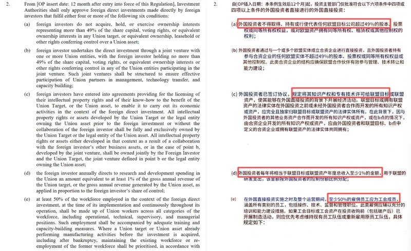 根据法案,海外投资如果要进入欧盟,至少得完成六项条件里的四个,除了要求 49% 的合资股权分配,另外还有技术转让、本地研发、保障就业、境内采购等等。如果不参与合资,那么你就会在税收、补贴、公共采购上被区别对待,基本等于失去竞争力。