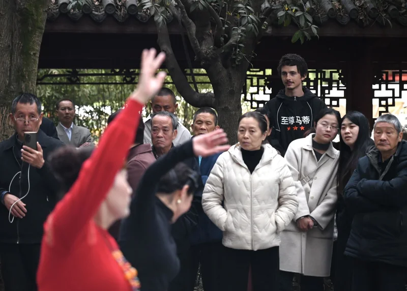 2026年3月8日,四川成都,提莫西·查拉梅在人民公园看坝坝舞、喝坝坝茶(图:视觉中国)