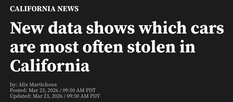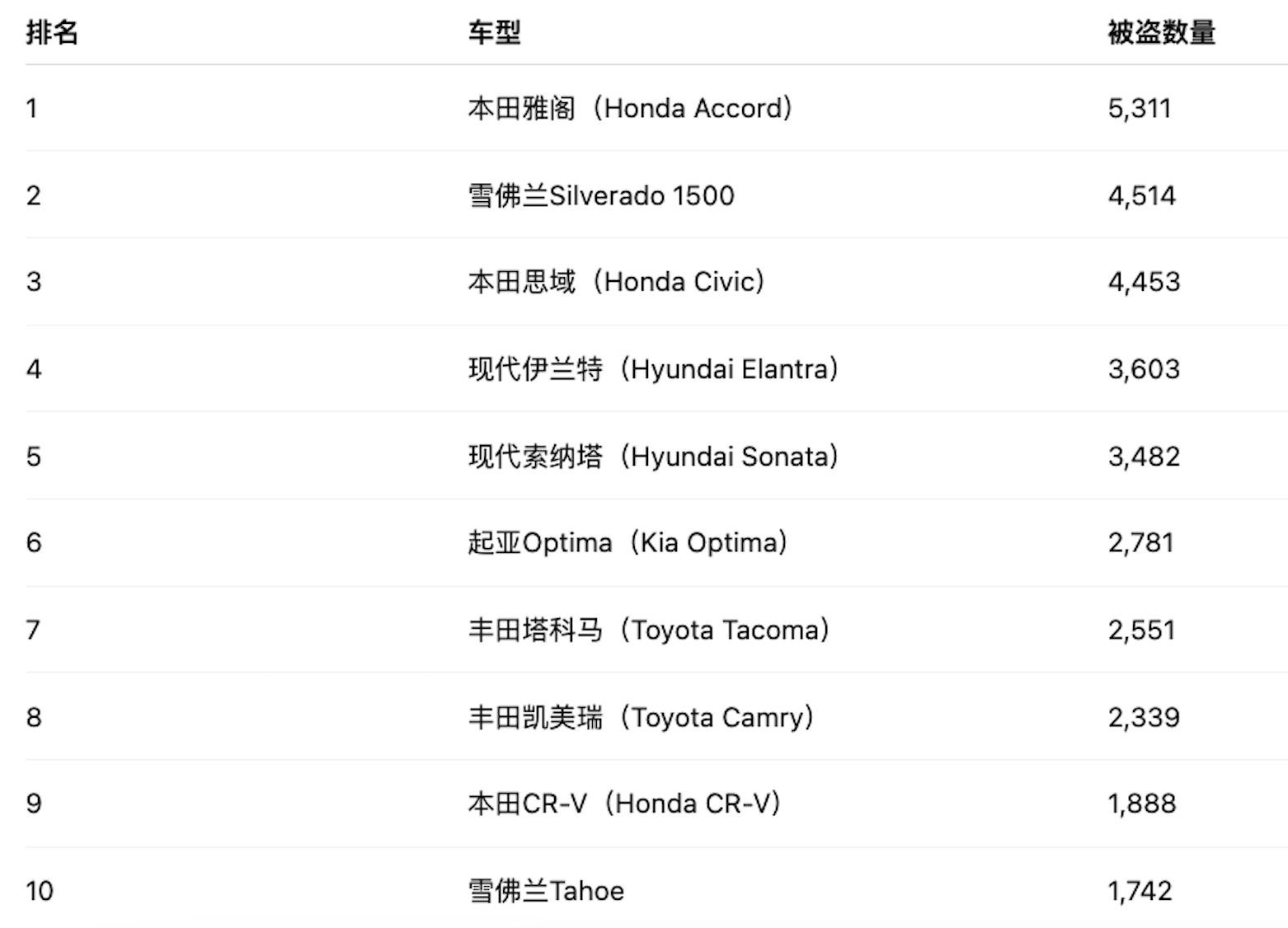 数据显示,2025年加州被盗的车辆主要集中在本田、现代、起亚和丰田品牌,其中本田雅阁、雪佛兰Silverado和本田思域位列前三。