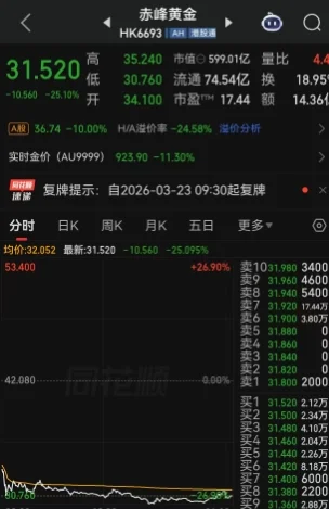 不过,在李金阳套现百亿之后,赤峰黄金的股东就没有那么幸运了。在今日赤峰黄金复牌之后,赤峰黄金港股开盘便大跌18%,盘中跌幅超过27%,短短几小时便打了七三折,截至收盘赤峰黄金港股大跌25.1%,市值缩水24.7亿港元(约合21.8亿元人民币)。