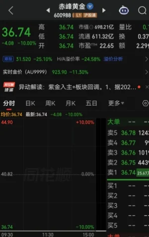 赤峰黄金A股则全天牢牢封死一字跌停,截至收盘赤峰黄金跌停盘仍有25.67万手封单(2567万股)排队出逃,价值超过9.43亿元。截至收盘,赤峰黄金股价报36.74元/股,A股市值单日蒸发68亿元。赤峰黄金A+H股市值一天之内缩水近90亿元。