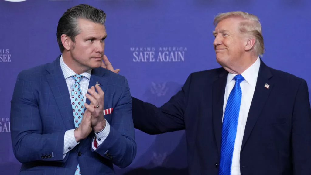 President Donald Trump speaks with Defense Secretary Pete Hegseth during a roundtable discussion on public safety at a Tennessee Air National Guard Base, March 23, 2026, in Memphis. AP - Mark Schiefelbein