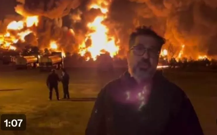伊朗油库被炸浓烟蔽天,一位记者在现场做连线报导。 图 : 视频截图