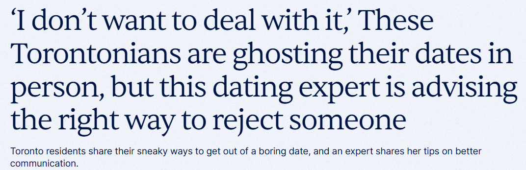 近期,Now Toronto采访了多伦多人如何脱身约会,同时请一位约会专家分享了她的看法。