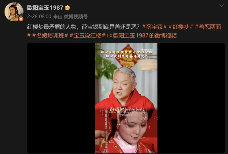 起因是87版《红楼梦》贾宝玉的扮演者欧阳奋强发了一条视频,用“装”字概括薛宝钗,认为她的一言一行都是功利性算计。他还呼吁现代女性要学林黛玉的“真性情”,别效仿宝钗的“伪装术”。