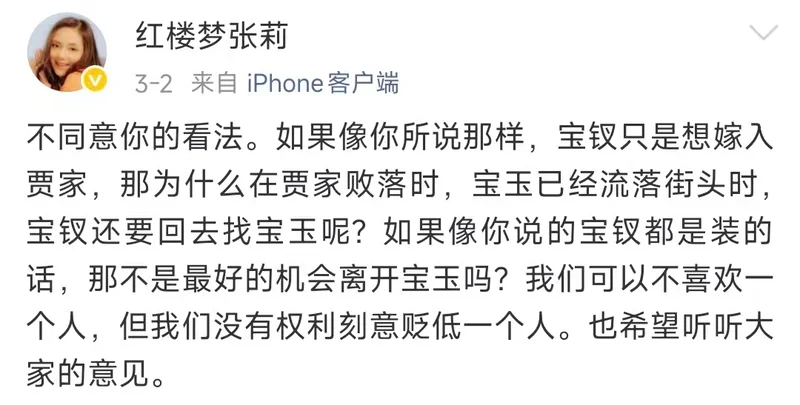 没想到,许久没有消息的薛宝钗扮演者张莉,罕见从大洋彼岸的加拿大发声回怼:“不同意你的看法。”