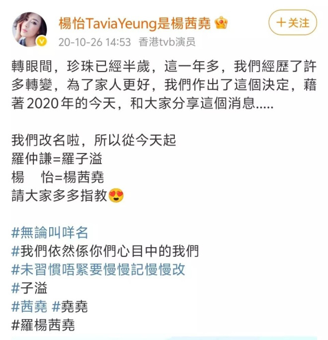 2020年,41岁的杨怡在社交媒体宣布改名杨茜尧,老公罗仲谦改名罗子溢,改名的原因说是为了家人更好。