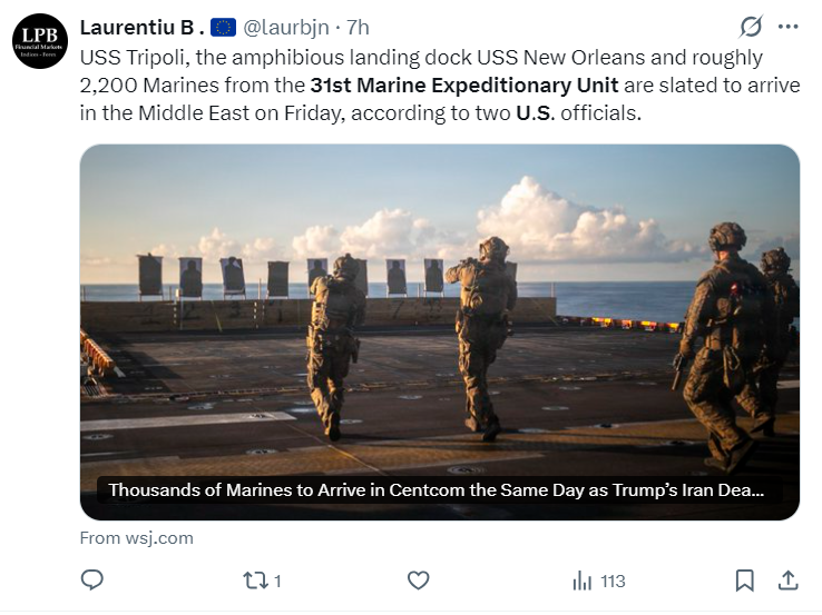 报道引述美方官员指,驻日美军两栖攻击舰「的黎波里号」(USS Tripoli)、两栖船坞登陆舰「新奥尔良号」(USS New Orleans)以及来自第31海军陆战队远征队约2200名海军陆战队员将于27日(本周五)进入美国中央司令部(CENTCOM,负责驻中东美军的指挥)。