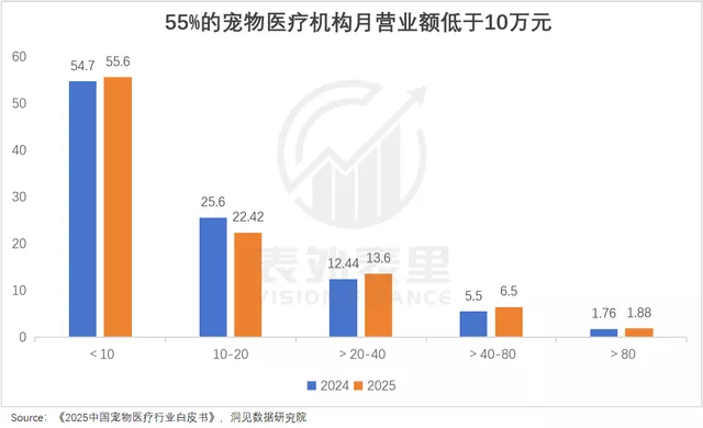 量价齐齐承压,门店却越开越密,宠物医院便陷入了“痛苦螺旋”:一边,是宠物主纷纷抱怨“猫狗看病比人贵”;另一边,是收入增长缓慢,55%的机构月营业额低于10万元。