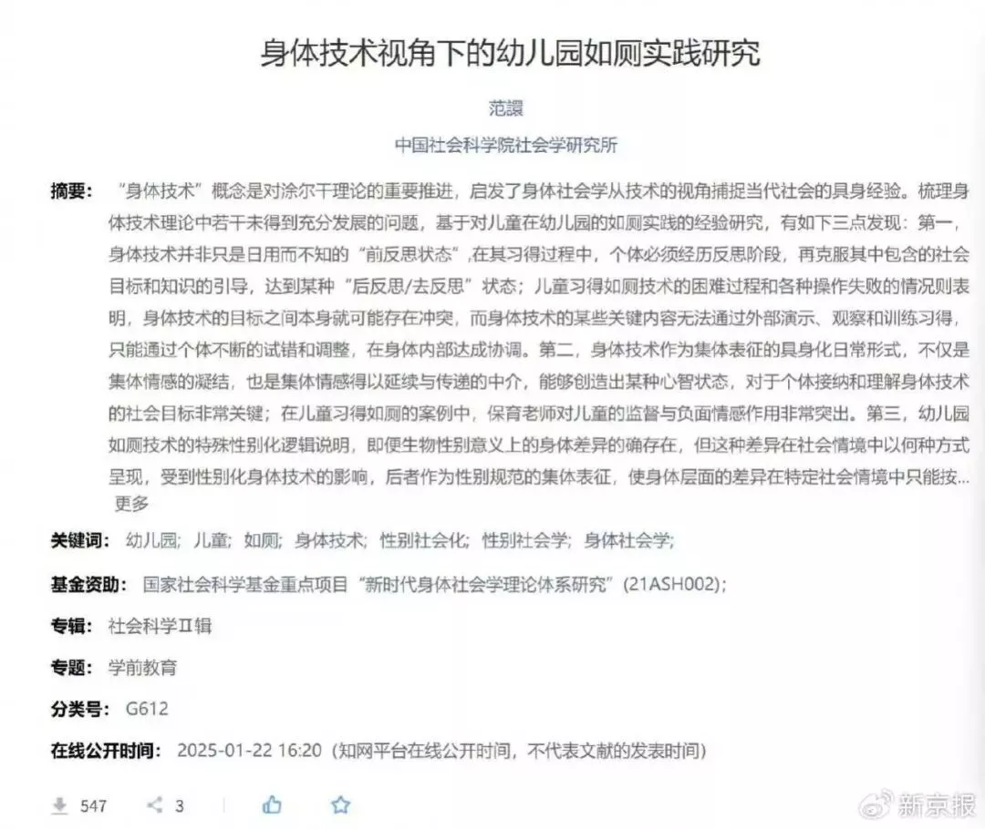 近日,福建师范大学学报(哲学社会科学版)一篇题为《身体技术视角下的幼儿园如厕实践研究》在网络上引起争议。