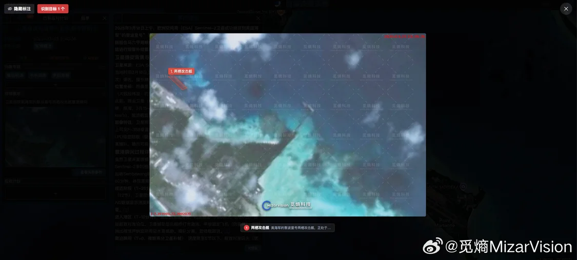 3月23号的卫星图像显示,美国海军的黎波里号两栖攻击航母(LHA-7)停靠迪戈加西亚。微博@觅熵