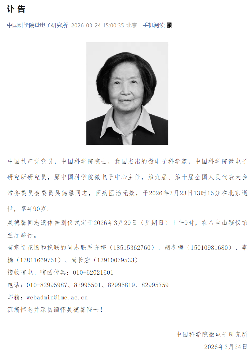 中国共产党党员,中国科学院院士,我国杰出的微电子科学家,中国科学院微电子研究所研究员,原中国科学院微电子中心主任,第九届、第十届全国人民代表大会常务委员会委员吴德馨同志,因病医治无效,于2026年3月23日13时15分在北京逝世,享年90岁。