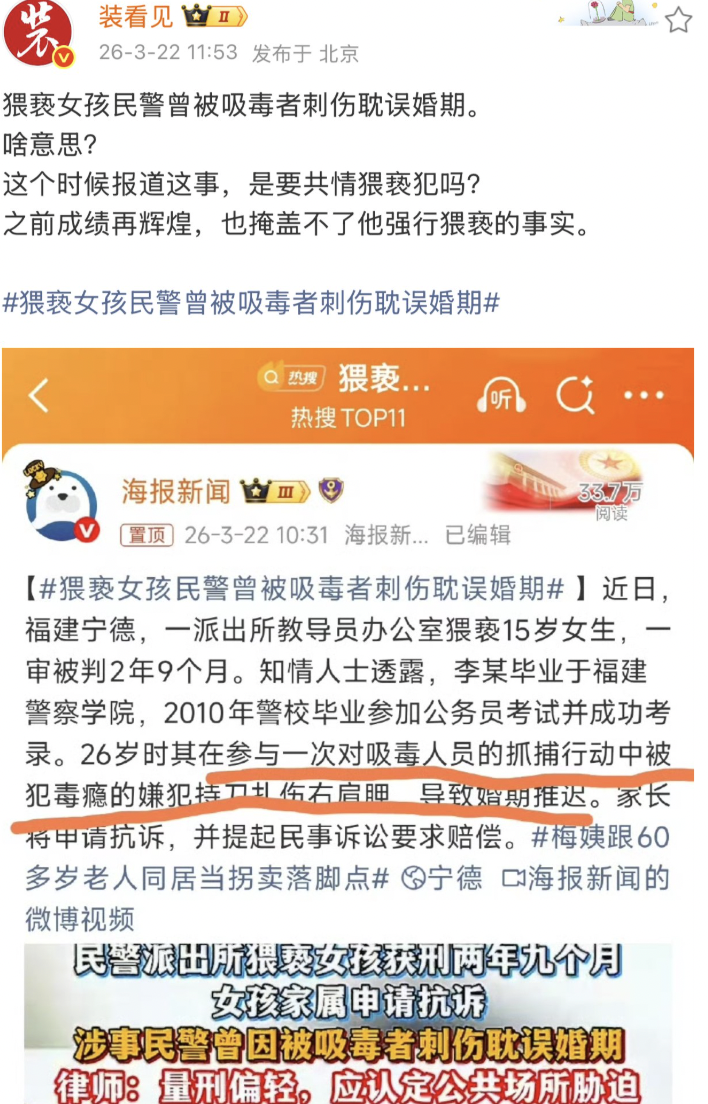 一条崭新的热搜:猥亵女孩民警曾被吸毒者刺伤耽误婚期。