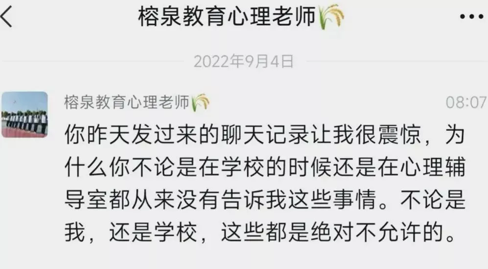二姐的提醒让陆青清醒了一些。2022年9月3日,陆青把他和张顺的聊天记录发给了榕泉学校的心理老师罗老师。