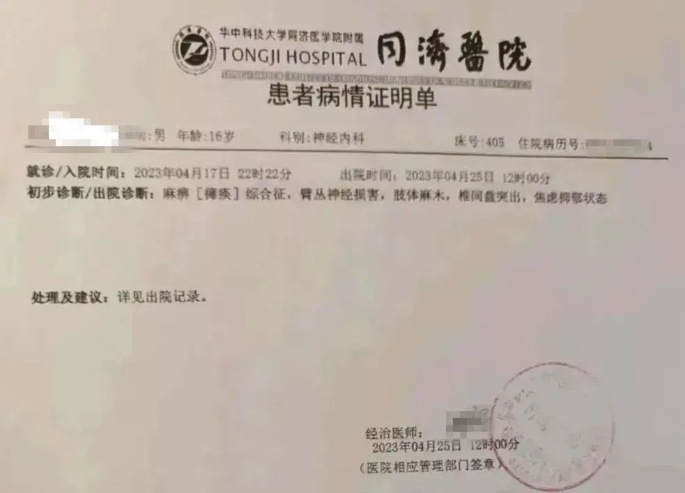 但有些事是无法轻松“放下”的。陆青告诉记者,自己真的试过“熬一熬”,但情绪不受控制地恶化,他甚至出现胃痛、恶心、呕吐的躯体化反应。察觉到自己的异样,陆青让家人带他去医院,2023年4月20日,经华中科技大学同济学院附属同济医院儿童保健科诊断,陆青患有重度抑郁和中度焦虑。