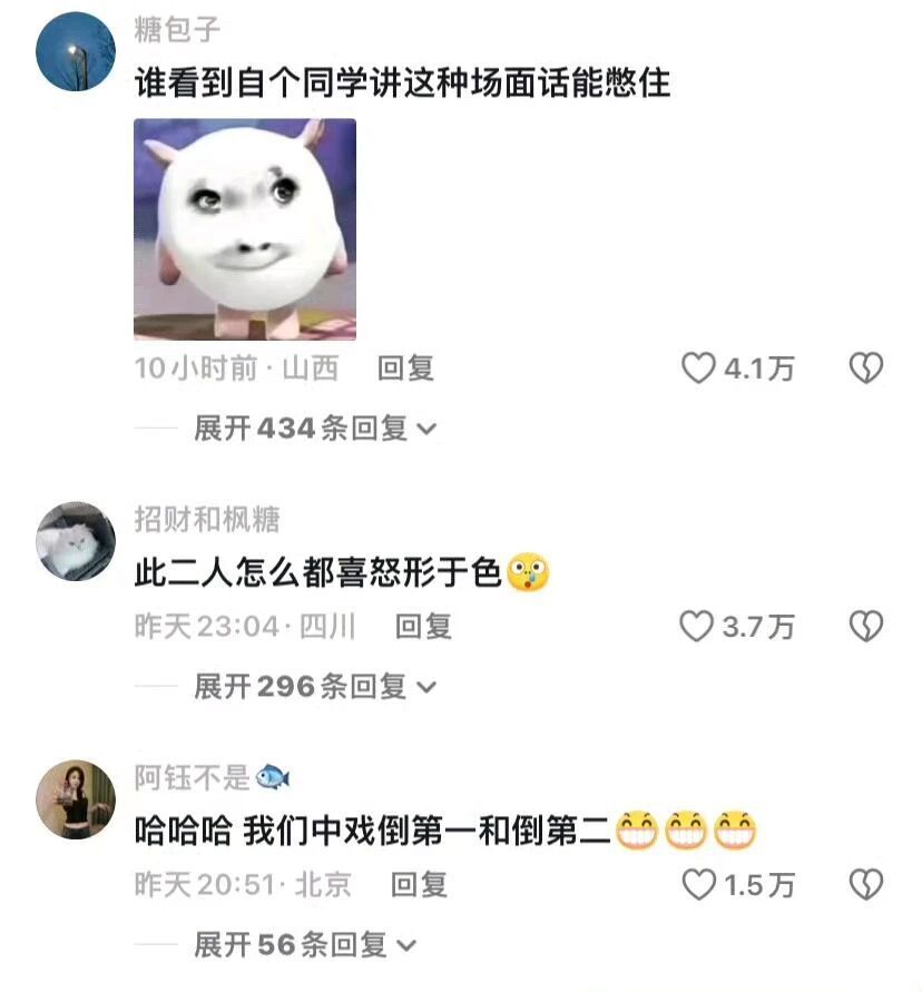 这段视频一上线就炸了,网友评论笑翻一片,最火的调侃就是“中戏倒数第一听倒数第二讲场面话就这样子”,还衍生出各种表情包,话题阅读量很快破亿。